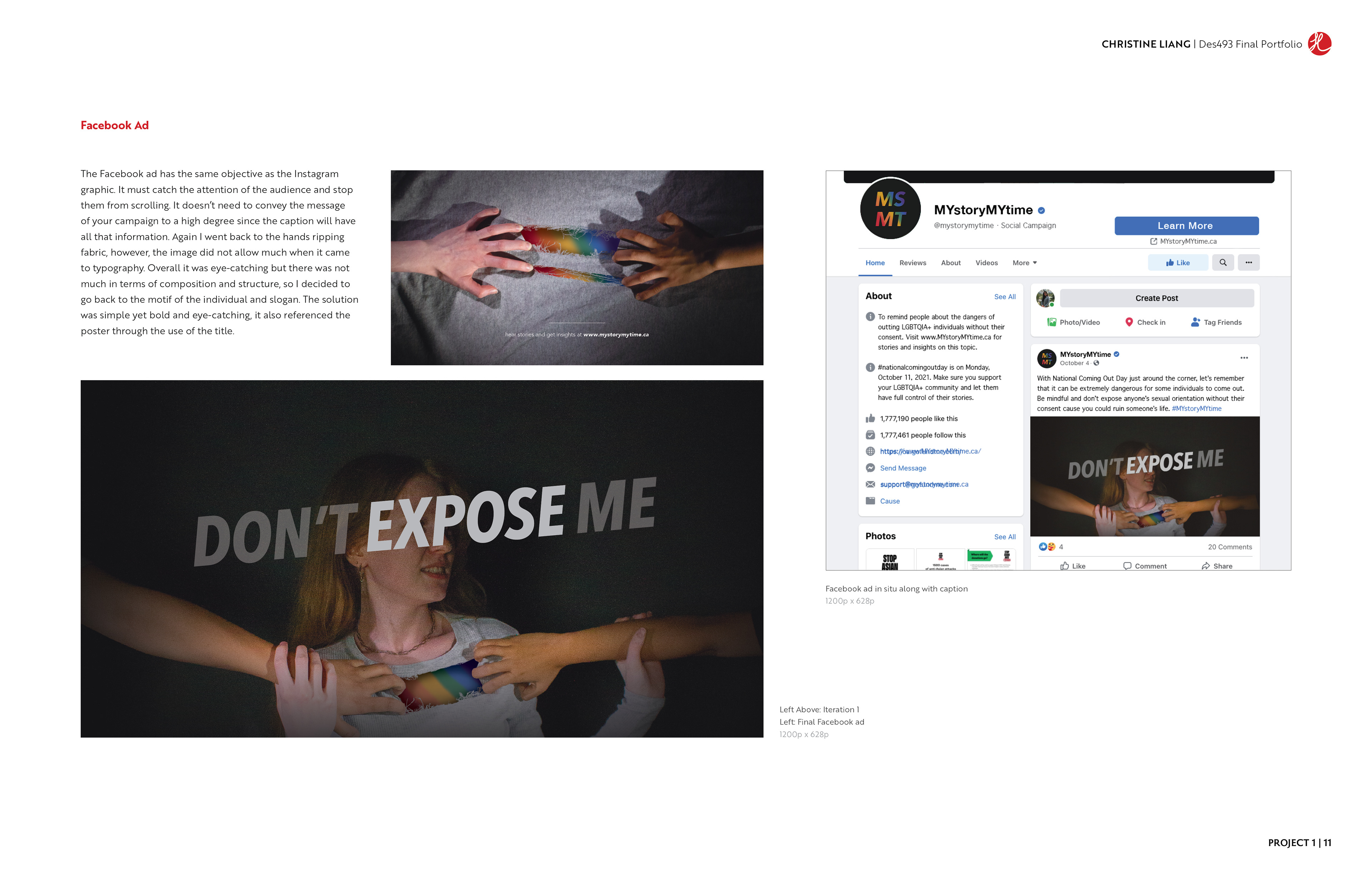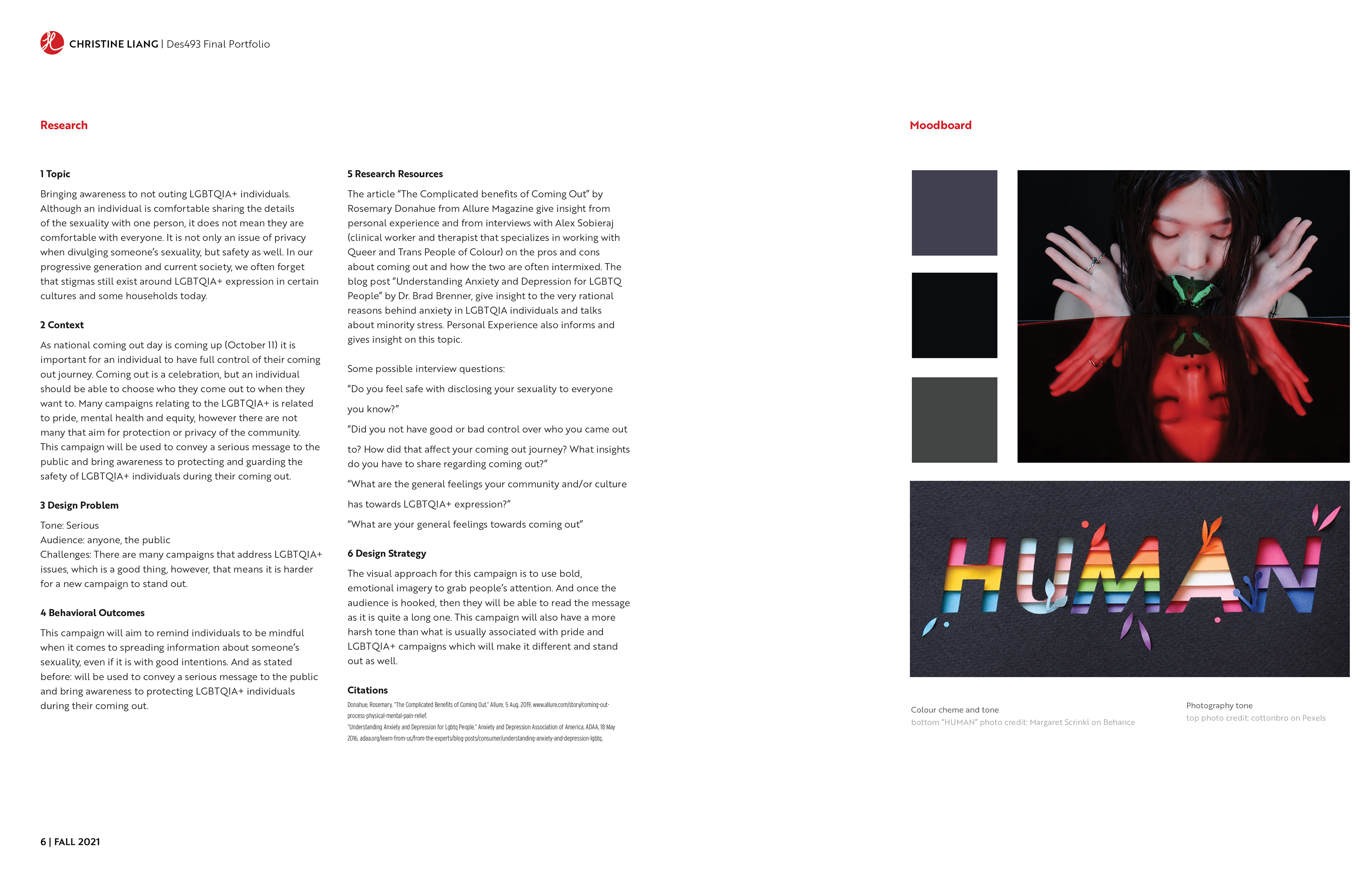 The portfolio had to be printed on 11" x 17" paper, put into a portfolio case and viewed as spreads. The requirements were to create a successful layout and hierarchy of information. The content had to present the final deliverables of each project, along with some process work to give context.